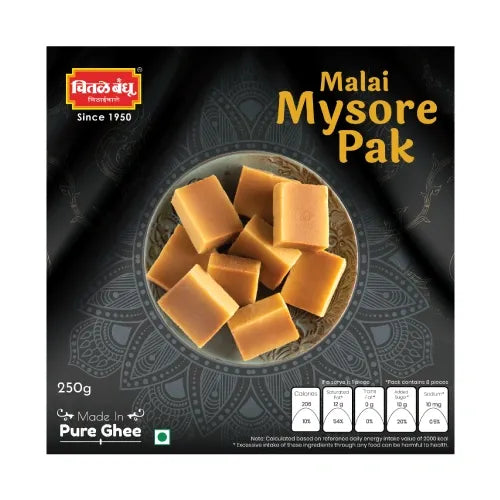 This variation of Mysore Pak is made with ghee, malai (milk solids), sugar, and besan (chickpea flour). It offers a creamy texture, unlike the traditional firmer version. Each piece is handmade in small batches using time-honored Indian techniques.