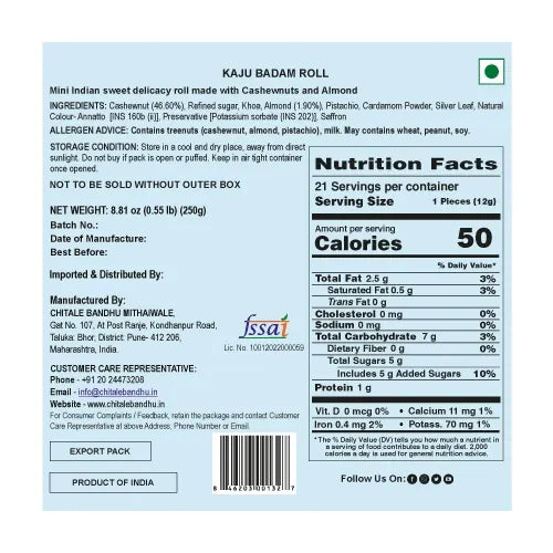 Experience the velvety smoothness of cashew paste delicately wrapped around whole almonds, creating a delightful contrast of textures in the Chitale Bandhu Kaju Badam Roll. Enhanced with just the right amount of sweetness, this exquisite delicacy promises to elevate any occasion with its blend of tradition and sophistication.