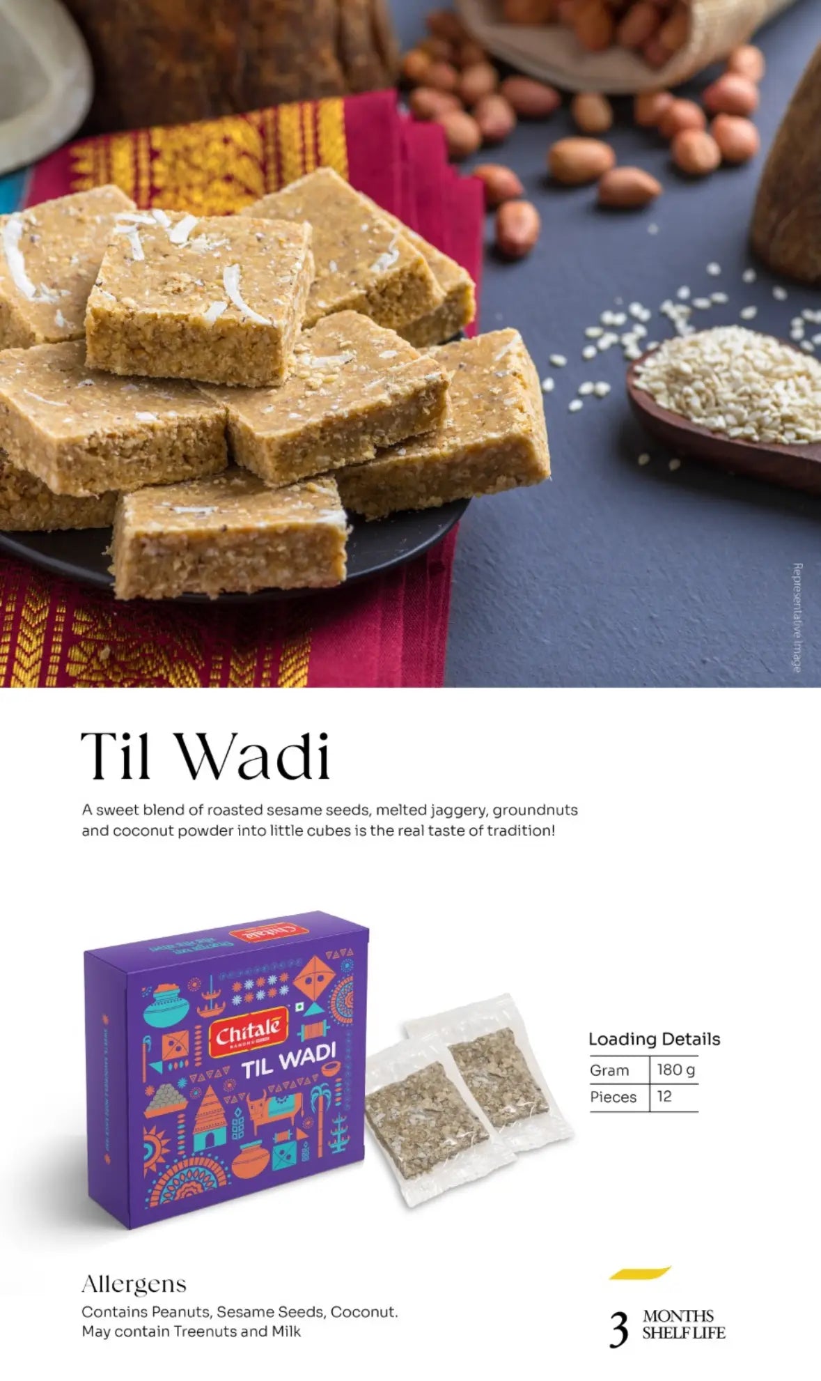 Celebrate the goodness of sesame seeds with Til Wadi, a traditional Indian sweet crafted with roasted sesame seeds and jaggery. This crunchy, nutty treat is rich in flavor and packed with nutrients, making it a perfect snack for festive occasions or as a wholesome daily indulgence. A favorite from Chitale Bandhu, Til Wadi offers a timeless taste of heritage in every bite.